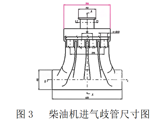 對(duì)于直噴式柴油機(jī),進(jìn)氣歧管只是將潔凈的空氣分配到各缸進(jìn)氣道,如圖3所示。進(jìn)氣歧管必須將空氣、 燃油混合氣或潔凈空氣盡可能均勻地分配到各個(gè)氣缸,為此進(jìn)氣歧管內(nèi)氣體流道的長(zhǎng)度應(yīng)盡可能相等。為了減小氣體流動(dòng)阻力,提高進(jìn)氣能力,進(jìn)氣歧管的內(nèi)壁應(yīng)該光滑。