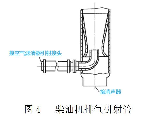 此外,需要注意的是當(dāng)采用上述旋流紙質(zhì)空氣濾清器時(shí),消聲器出口處需預(yù)裝有與之匹配的排氣引射管(安裝在消聲器出口處,如圖4所示)。當(dāng)柴油機(jī)排氣時(shí),高速氣流通過(guò)喉管處使廢氣氣流增大,于是便形成了真空度。利用此真空度將空氣濾清器集塵室中的塵粒經(jīng)橡膠管吸入排氣引射管內(nèi),并與柴油機(jī)廢氣一起排出。