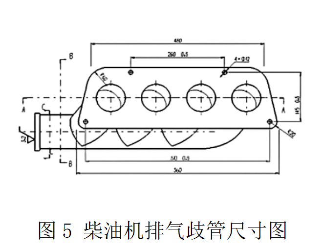 柴油機(jī)排氣管的作用是使廢氣從氣缸排出,結(jié)構(gòu)尺寸如圖5所示。排氣管應(yīng)具有較小的氣流阻力,以減小進(jìn)氣和排氣阻力。現(xiàn)代柴油機(jī)還要求排氣管的結(jié)構(gòu)形狀有利于氣流的慣性與壓力脈動(dòng)效應(yīng),以提高充量和排氣能量的利用率。