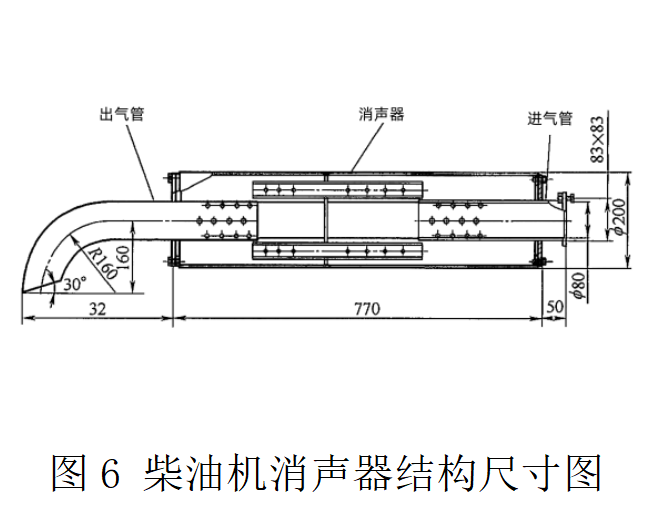 如圖6所示為基本型柴油機(jī)的消聲器,它是多腔膨脹共振型(在膨脹筒圓周充填有吸聲的超細(xì)玻璃纖維),在標(biāo)定工況下可使噪聲下降約30dB(A)。
