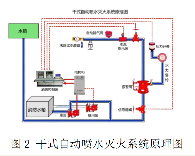 高層建筑內(nèi)一般都設有自動噴水滅火系統(tǒng),其供水設施是現(xiàn)成的,經(jīng)濟方便,原理如圖2所示。自動噴水對固體表面火災的作用主要有冷卻、控火、防止火災蔓延,但對于發(fā)電設備、電器設備可能產(chǎn)生危害。如正在工作的發(fā)電機組發(fā)生火災,其溫度很高,突然噴水,因熱脹冷縮效應,可能產(chǎn)生爆裂而受損;電氣設備經(jīng)水噴淋后,可能失去正常工作的功能。另外,水不能撲救電氣火災和可燃液體火災。