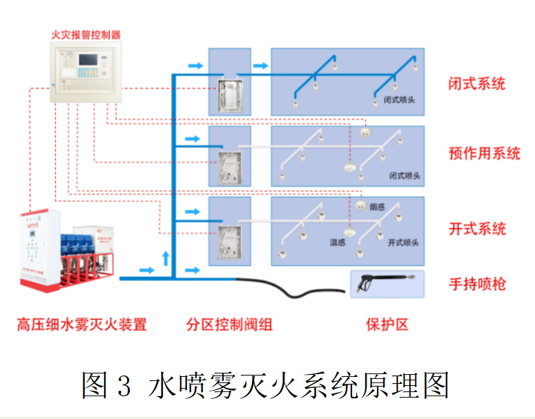 水噴霧滅火系統(tǒng),是由自動噴水滅火系統(tǒng)派生出來的一種自動滅火系統(tǒng),原理如圖3所示。一般情況下,它可以和自動噴水滅火系統(tǒng)共用供水設施。它的滅火性能和滅火效果是: