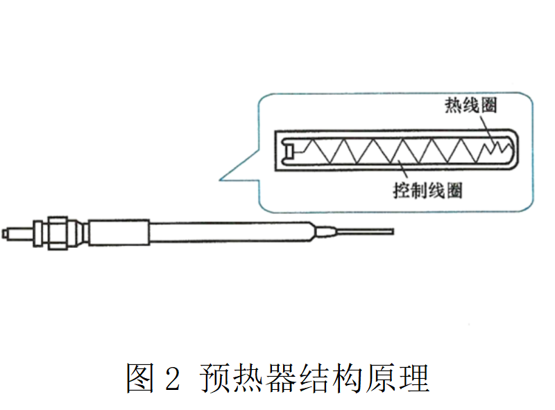 用于加熱燃燒室的空氣,如圖1所示;預(yù)熱器又稱為預(yù)熱塞,其結(jié)構(gòu)原理如圖2所示。預(yù)熱器內(nèi)裝有控制線圈,當(dāng)其電阻隨著溫度的升高而增加時(shí),可以減少流往與控制線圈串聯(lián)的熱線圈的電流量,使預(yù)熱器的溫度不會上升過高。預(yù)熱器的溫度可升至約900℃。