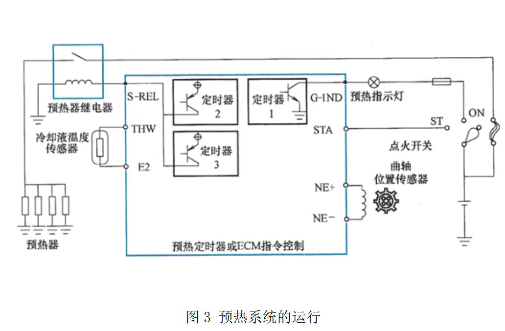 ② 當(dāng)起動開關(guān)旋至ST時(shí),預(yù)熱定時(shí)器或ECU指令控制將預(yù)熱器接通,防止預(yù)熱器溫度在起動時(shí)下降和改善起動性能。